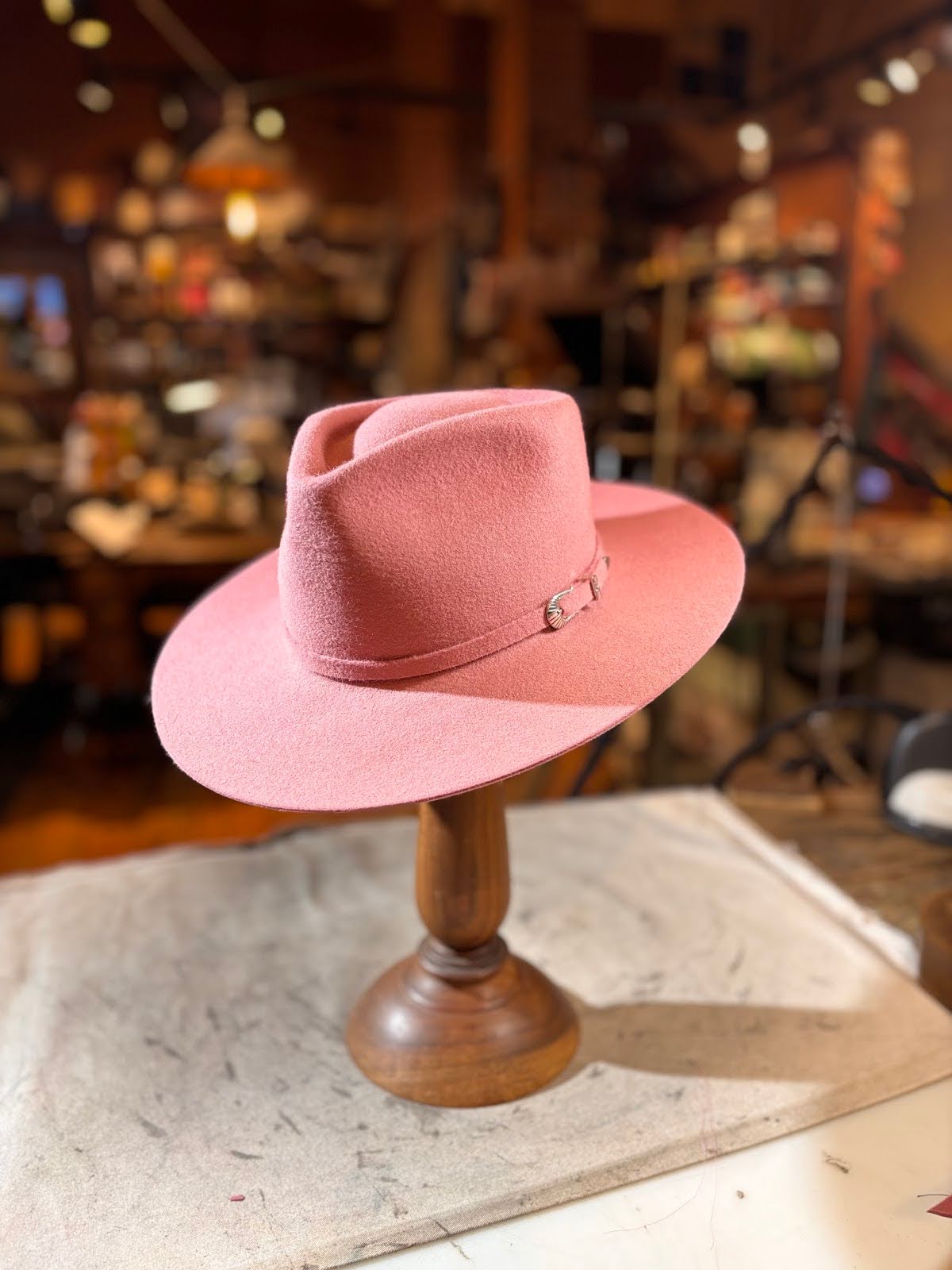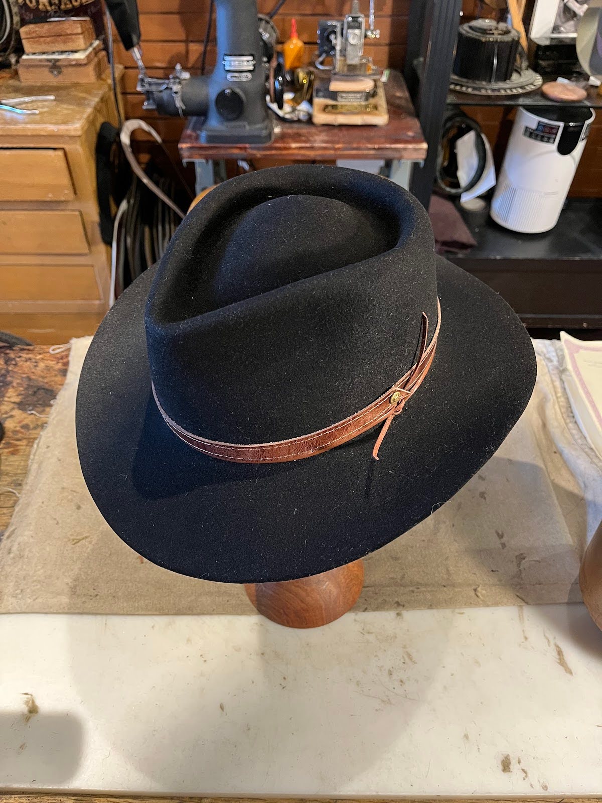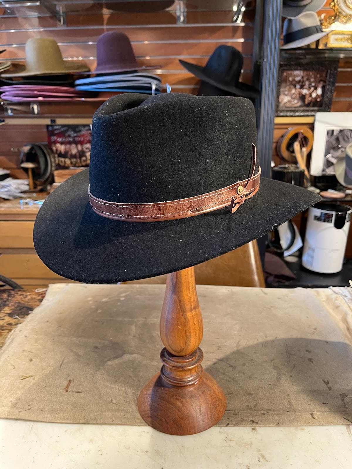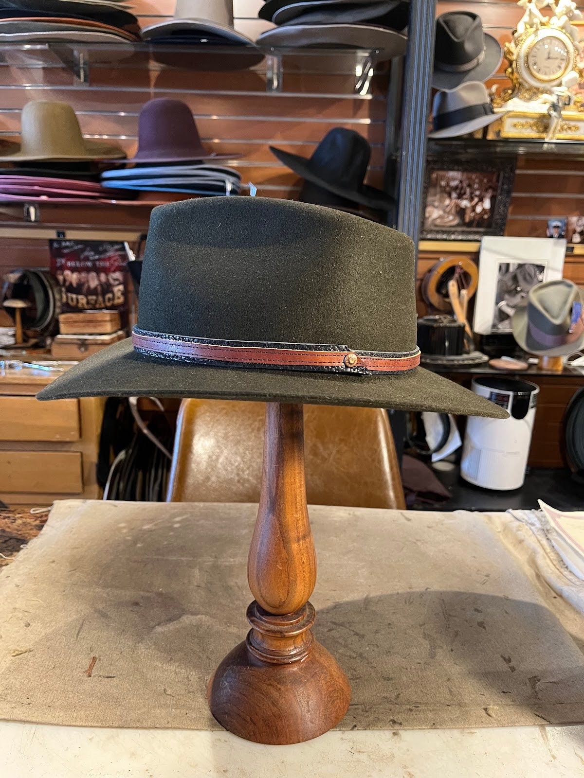 Characteristic features of this hat include a curved 2 ½” brim, 4” crown, and crown back with a 5” open crown. Hat bands vary, and can be tailored to suit individual preferences, with such options as leather, matching felt buckle, horsehair, or grosgrain ribbon.