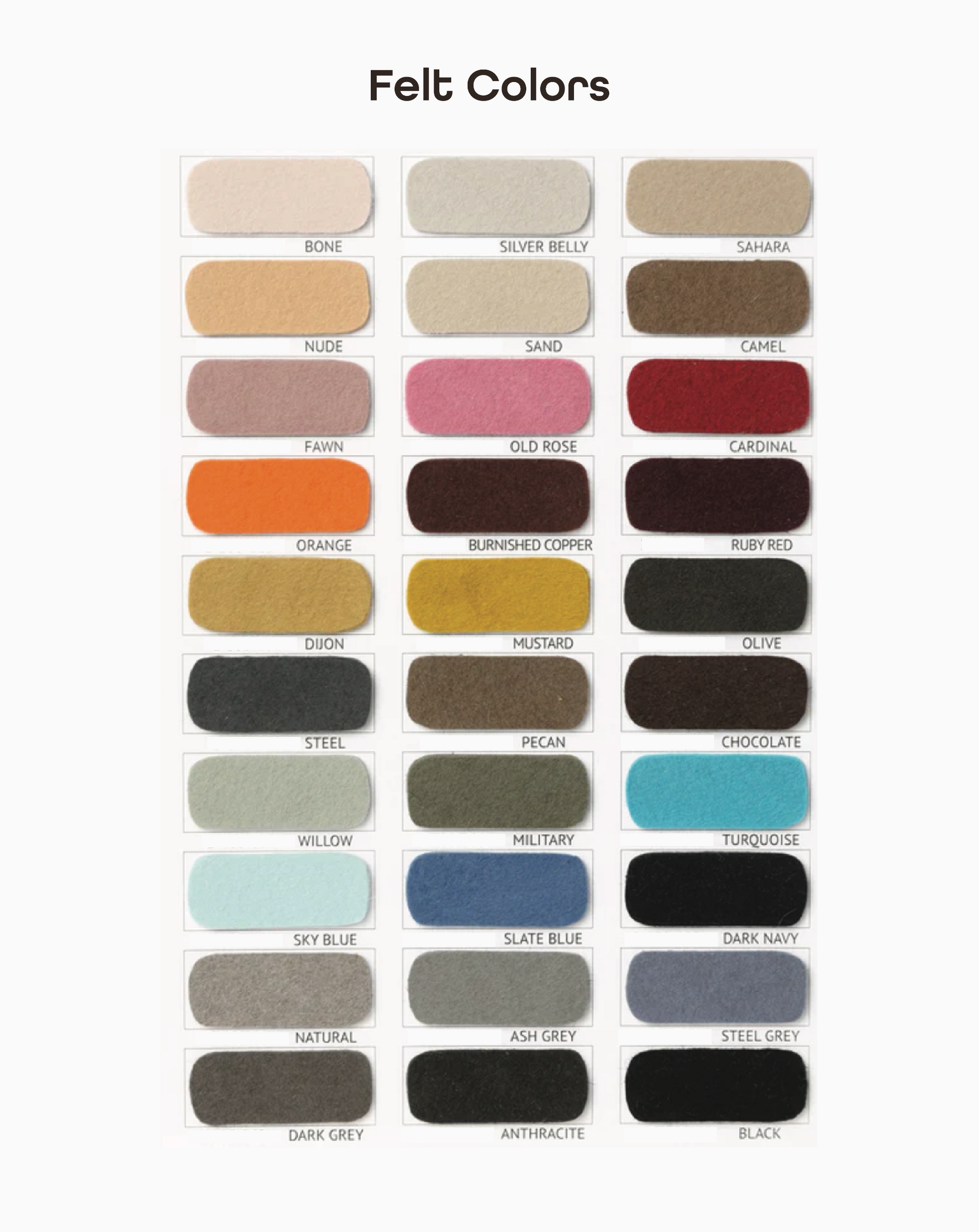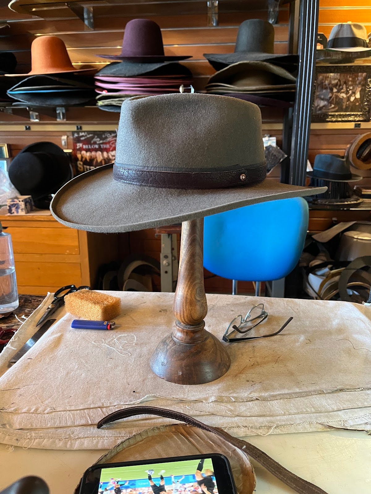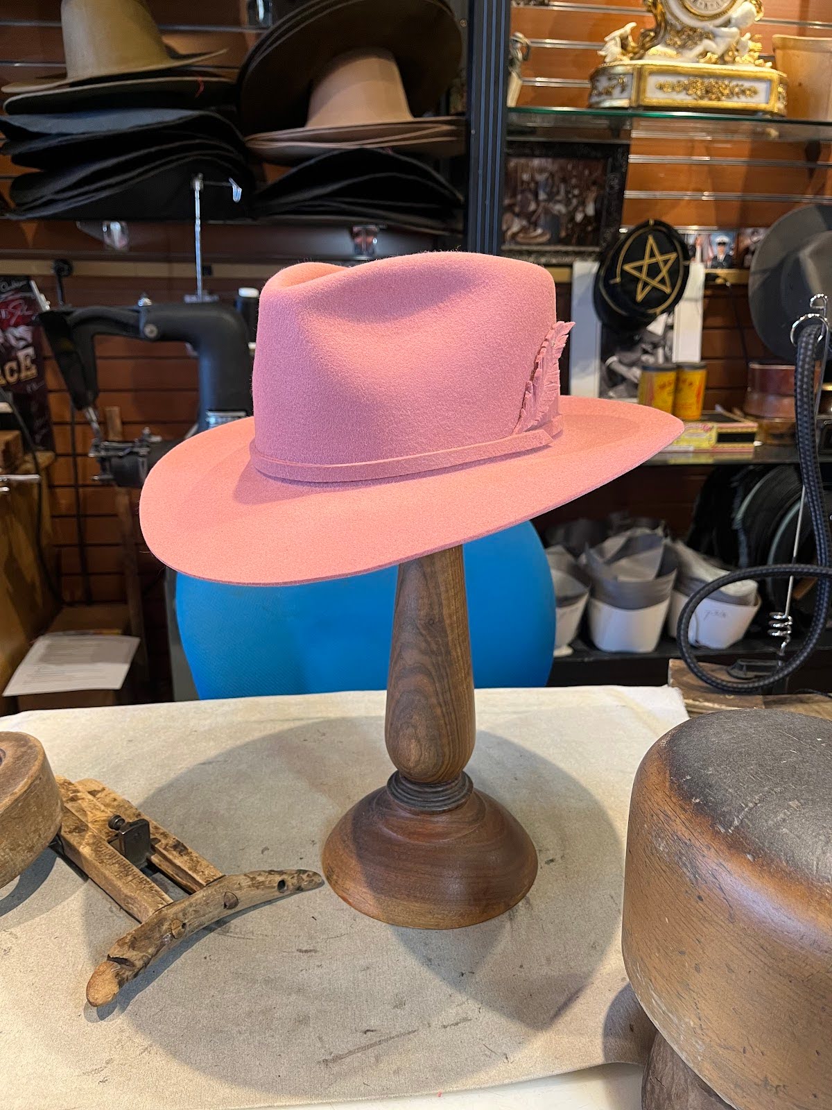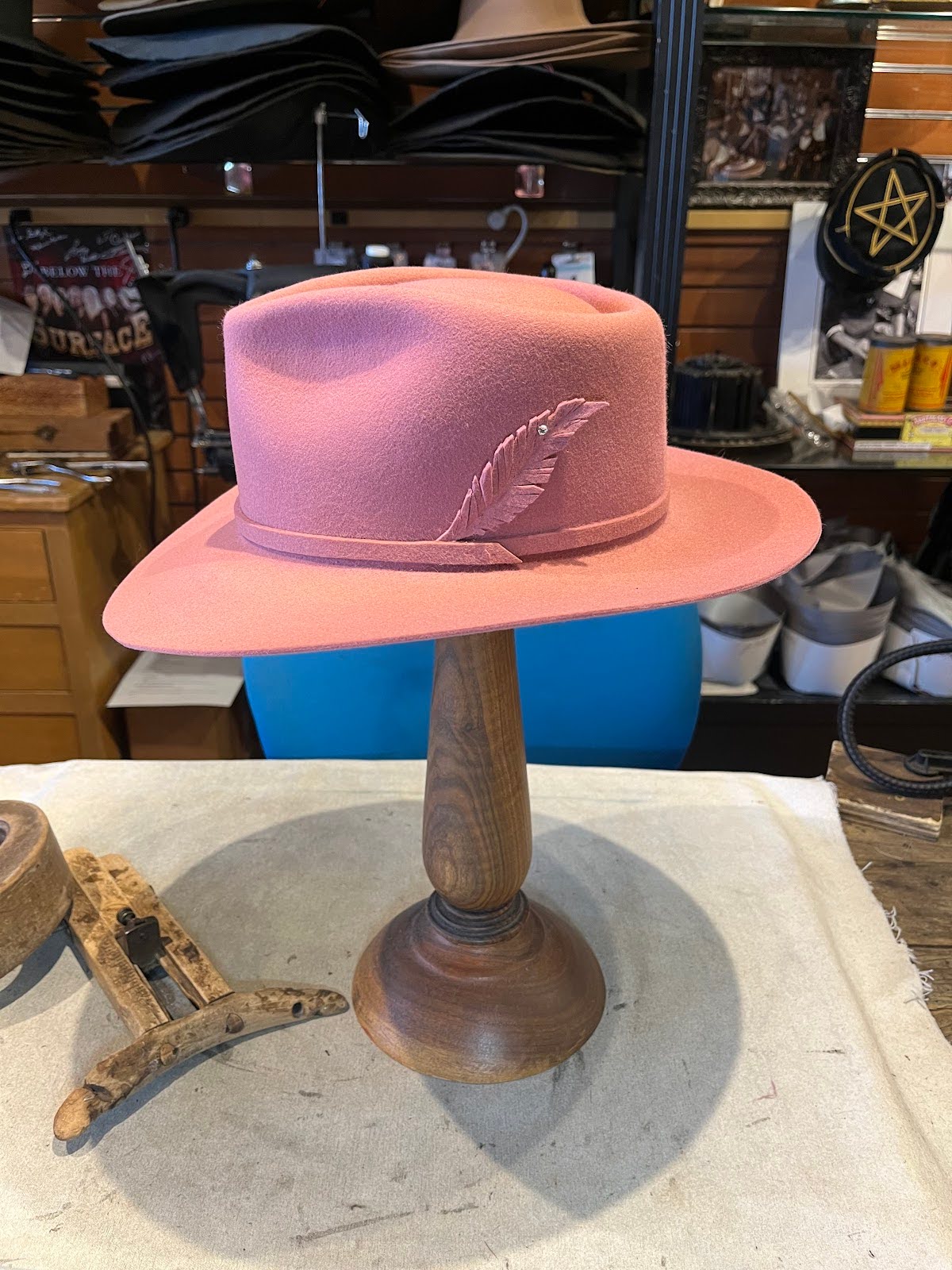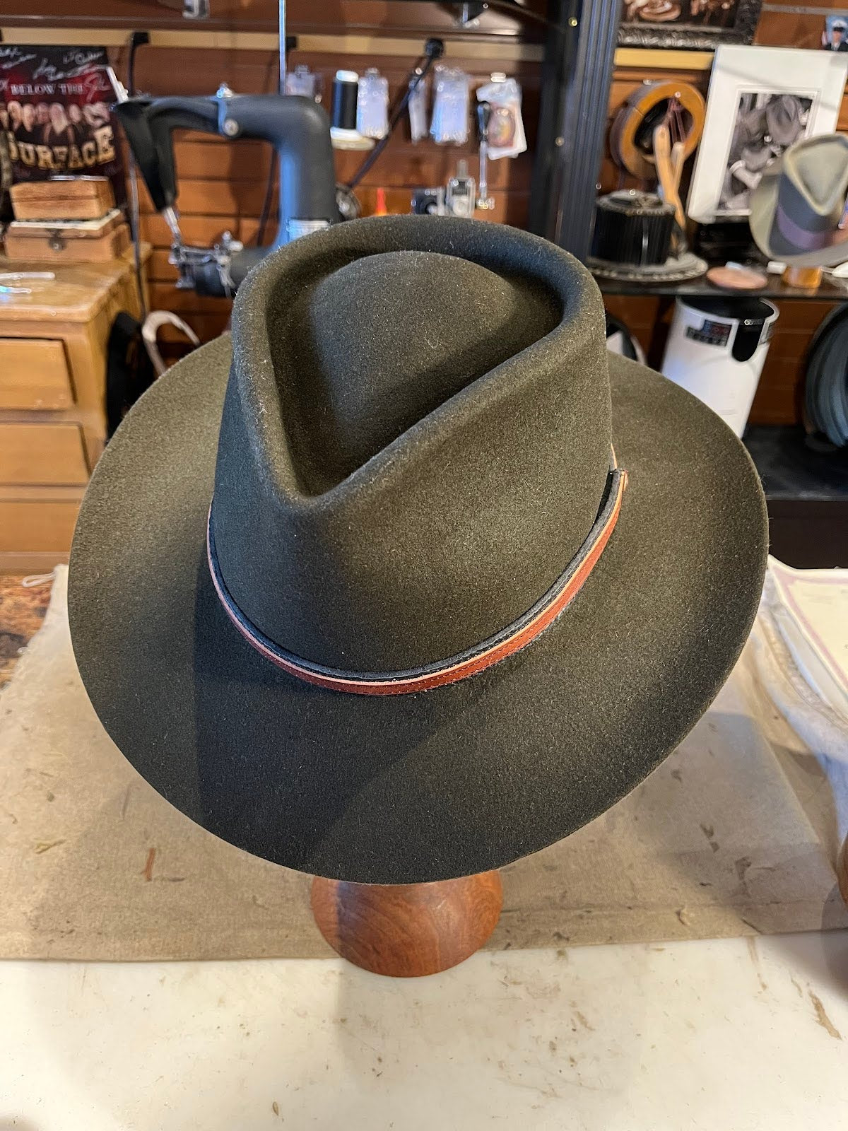 Characteristic features of this hat include a curved 2 ½” brim, 4” crown, and crown back with a 5” open crown. Hat bands vary, and can be tailored to suit individual preferences, with such options as leather, matching felt buckle, horsehair, or grosgrain ribbon.