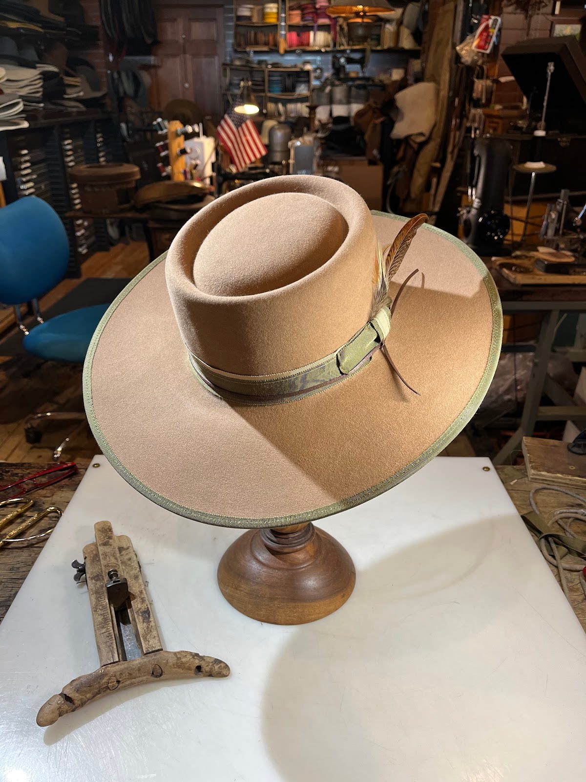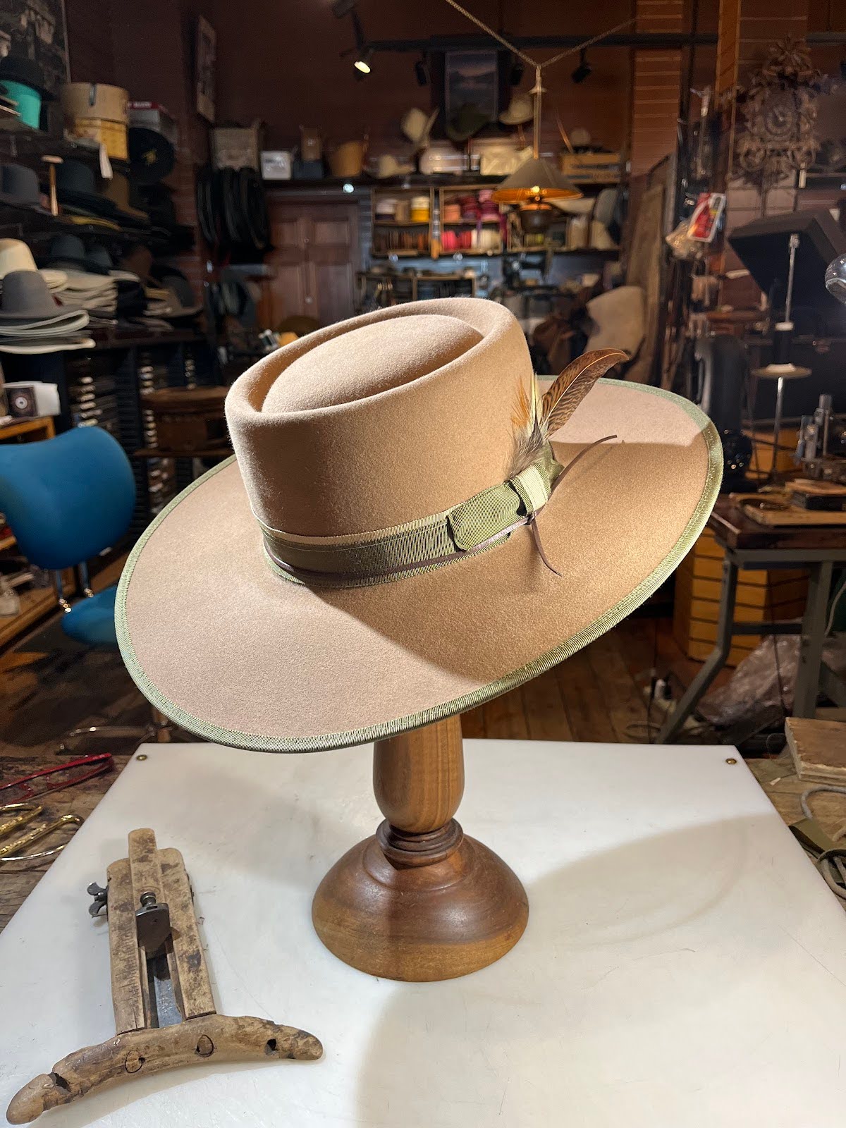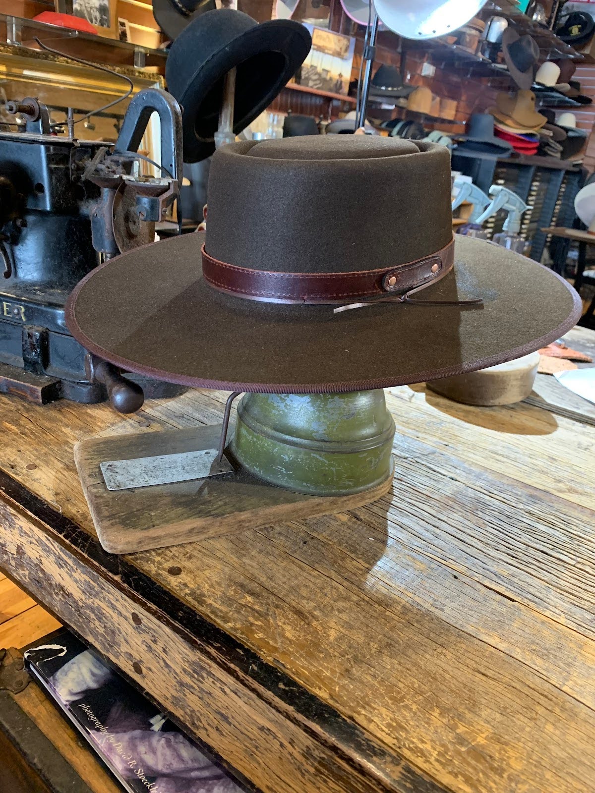 Coming standard with a 4” high flat, dented crown and a wide 4” brim accented with a pencil roll, a bound edge, and a matching 1” grosgrain ribbon, you tell us how you would like the brim angled.