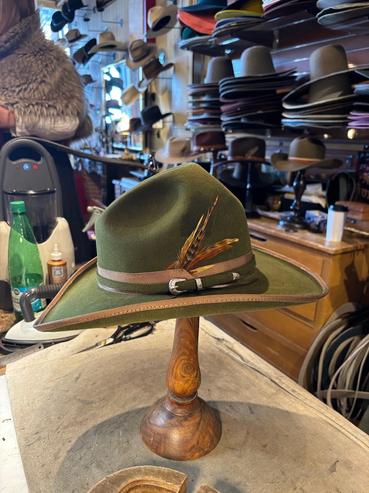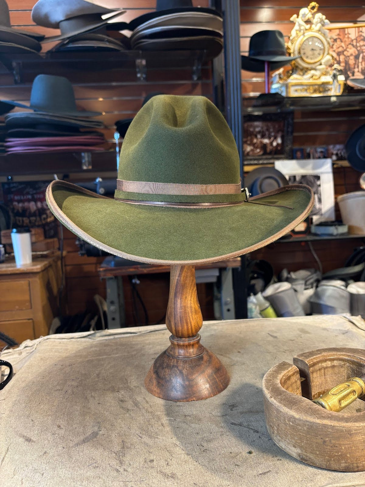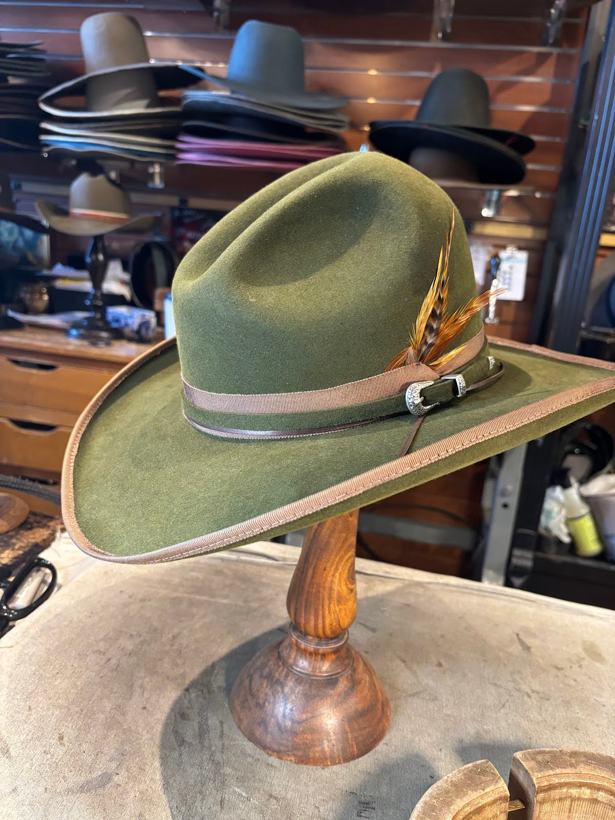 Inspired by the old western styles, this modern cowboy hat is seen anywhere from sites to ranches, and everywhere in between. With a slightly rising crown (3 ½” front, 6” back), heavy concave dents on the sides, and a long central dent on the top of the hat, this hat comes standard with a 1” grosgrain ribbon – but looks great with horsehair, too. Popular upgrades include the bound edge or the mule kick (a small dip in the back of the crown).