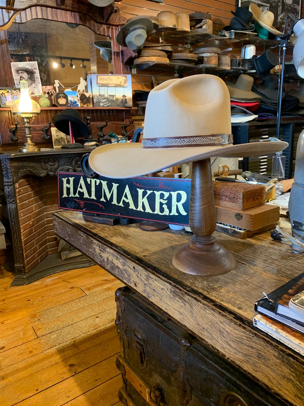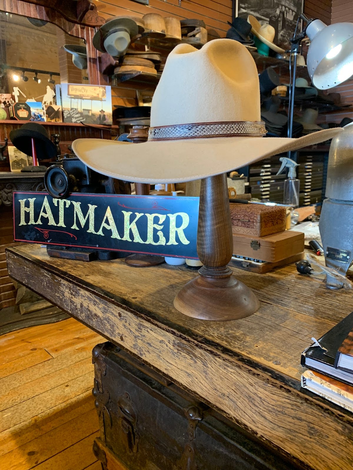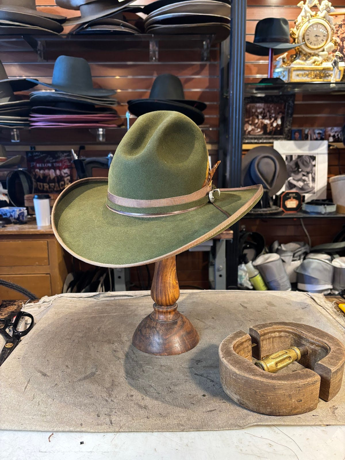 Inspired by the old western styles, this modern cowboy hat is seen anywhere from sites to ranches, and everywhere in between. With a slightly rising crown (3 ½” front, 6” back), heavy concave dents on the sides, and a long central dent on the top of the hat, this hat comes standard with a 1” grosgrain ribbon – but looks great with horsehair, too. Popular upgrades include the bound edge or the mule kick (a small dip in the back of the crown).