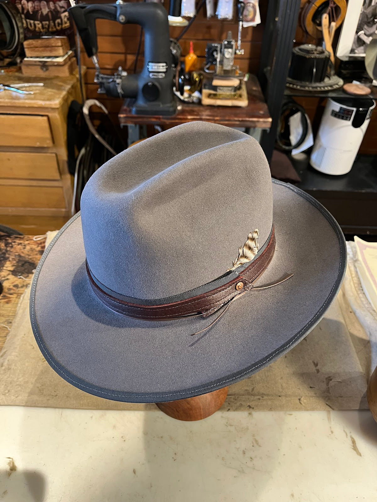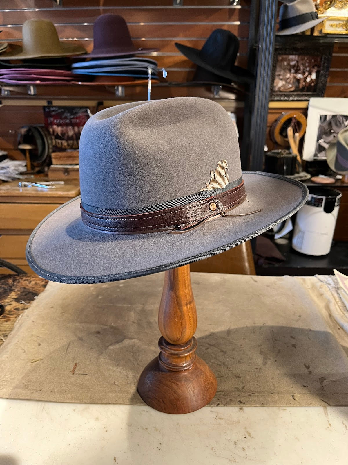 There are many professionals in the field that say this was the best-selling hat style in the history of the world. We aren’t sure of the validity of that claim, but we will agree that this hat has been a popular choice for many generations. Certain trademark features of this hat include a front-to-back crown crease, equilateral double dents, and grosgrain ribbon edging. With its moderately wide, flanged, 2 ⅞” brim and a 5 ½” crown, this hat will surely remind one of past century western movies.