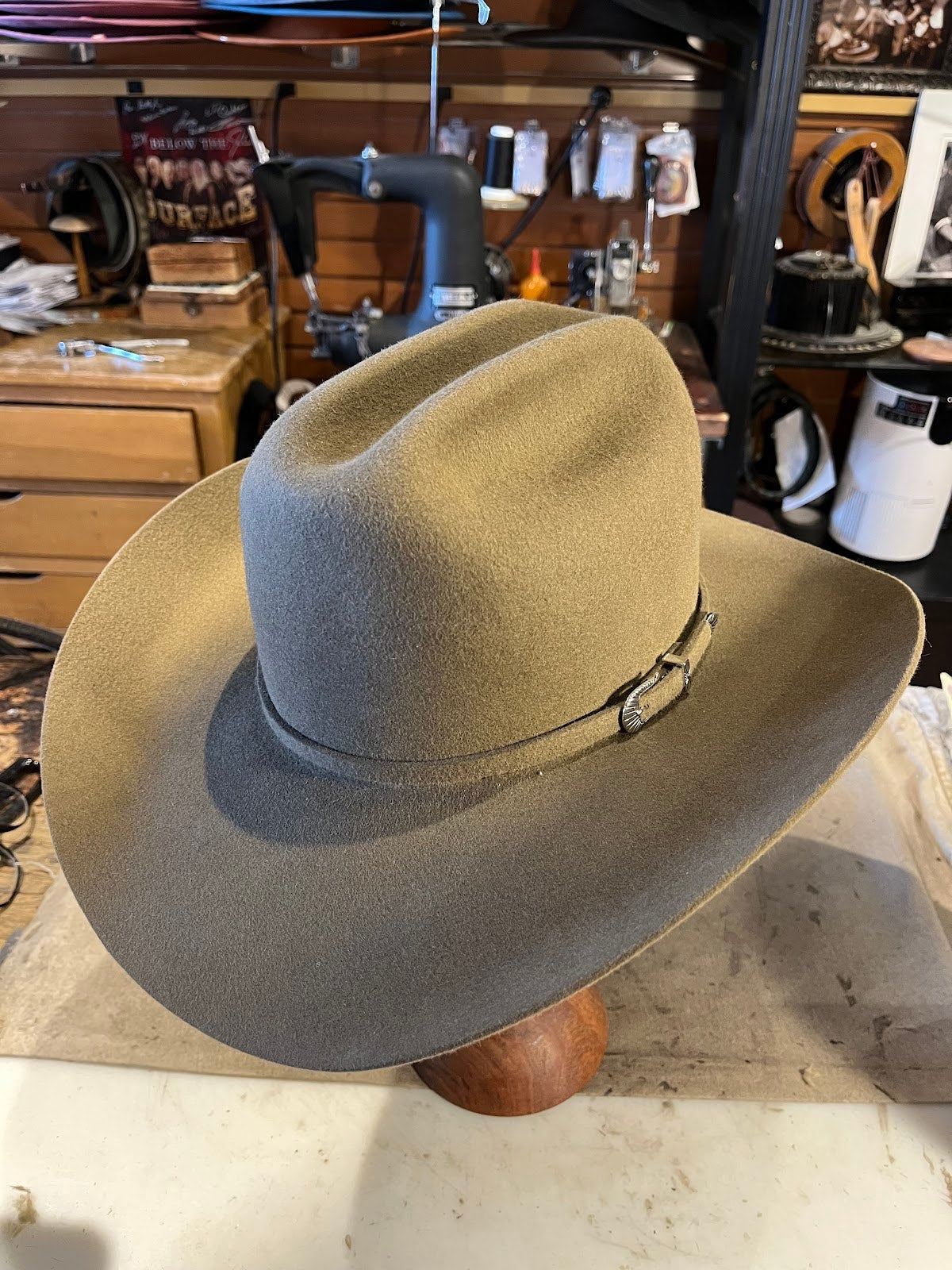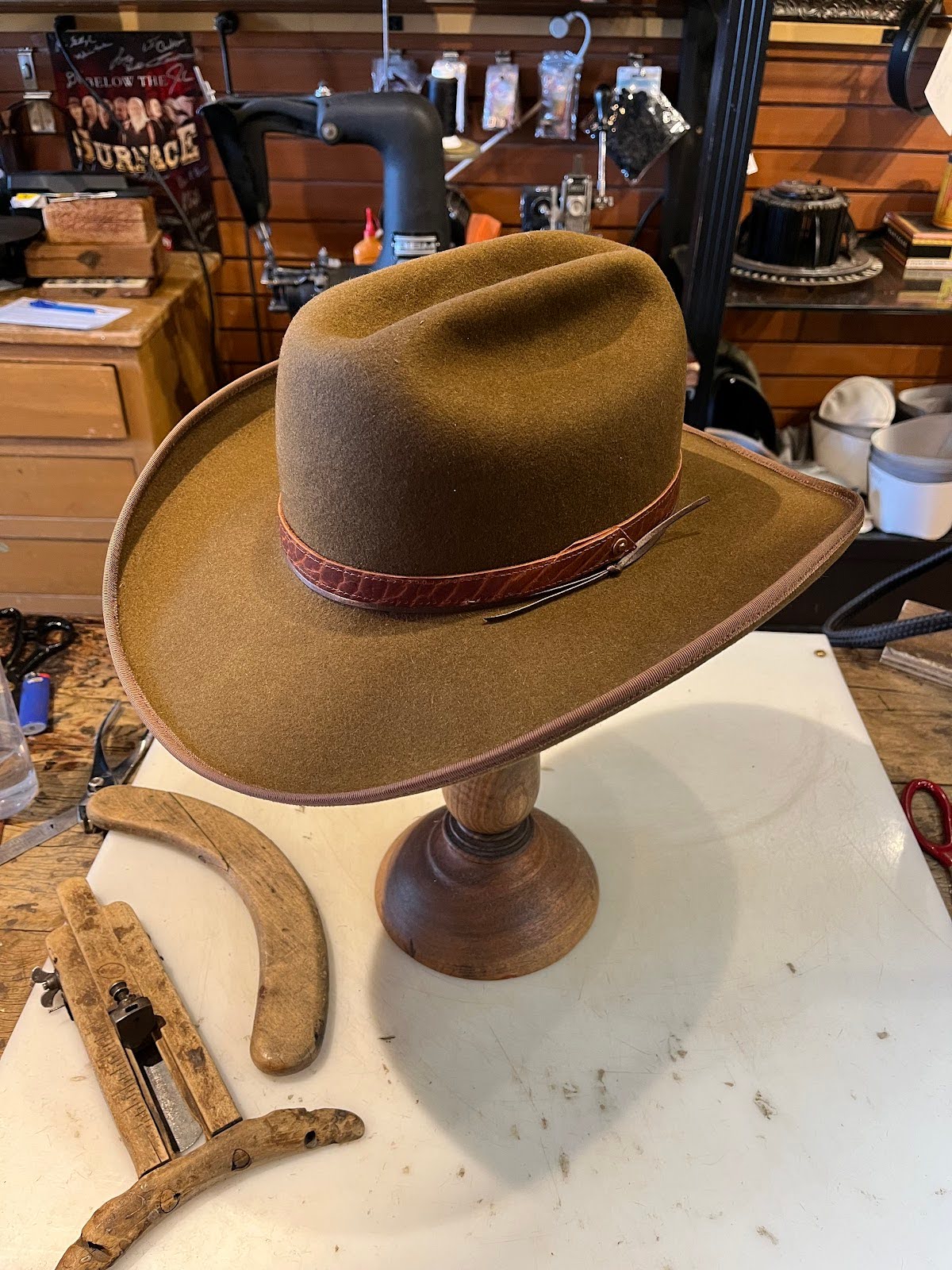Specific features of this hat include a 4-4 ½” front-to-back crown crease, equilateral double dents and a thing ¼” grosgrain hat band. The 4”-5” brim can be modified in a number of ways: