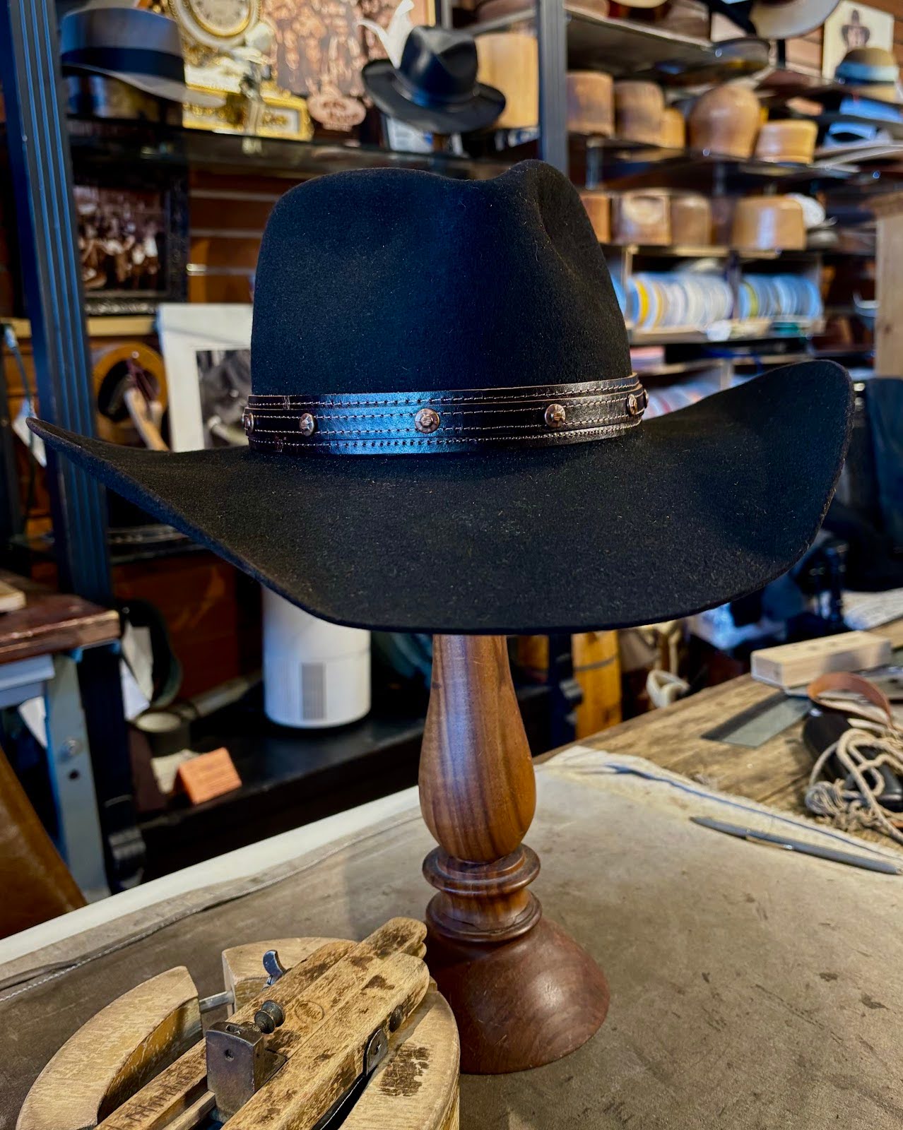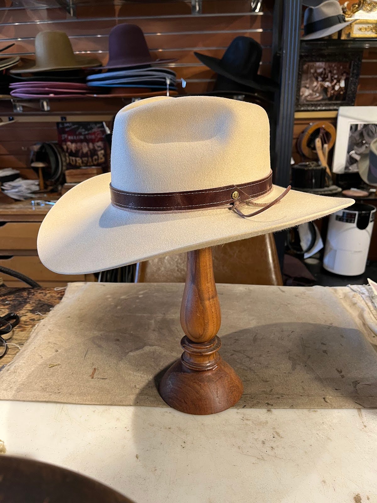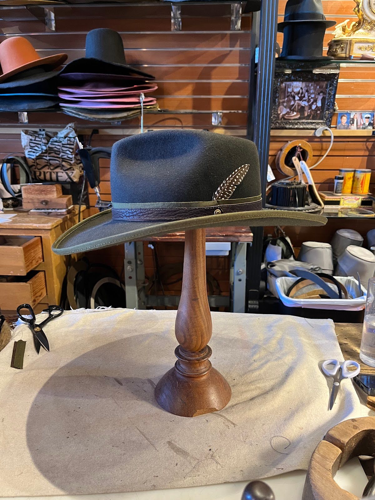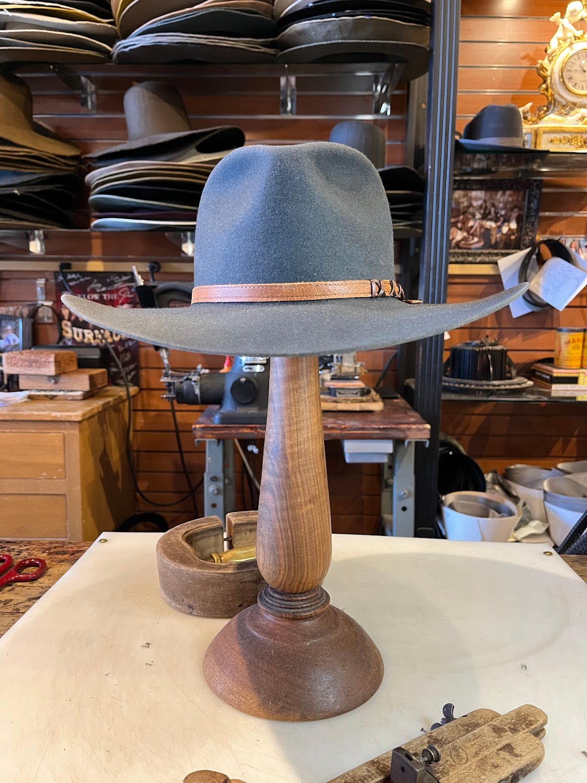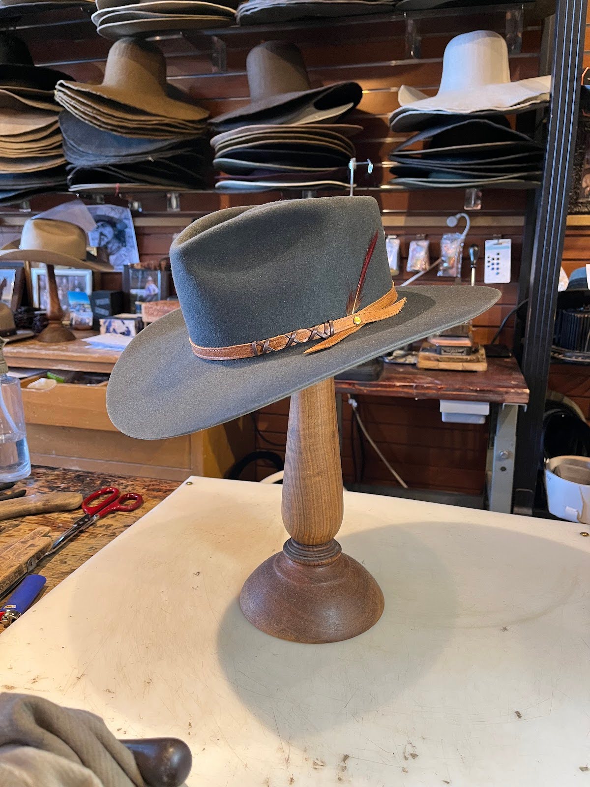Characteristic features of this hat include a curved 2 ½” brim, 4” crown, and crown back with a 5” open crown. Hat bands vary, and can be tailored to suit individual preferences, with such options as leather, matching felt buckle, horsehair, or grosgrain ribbon.