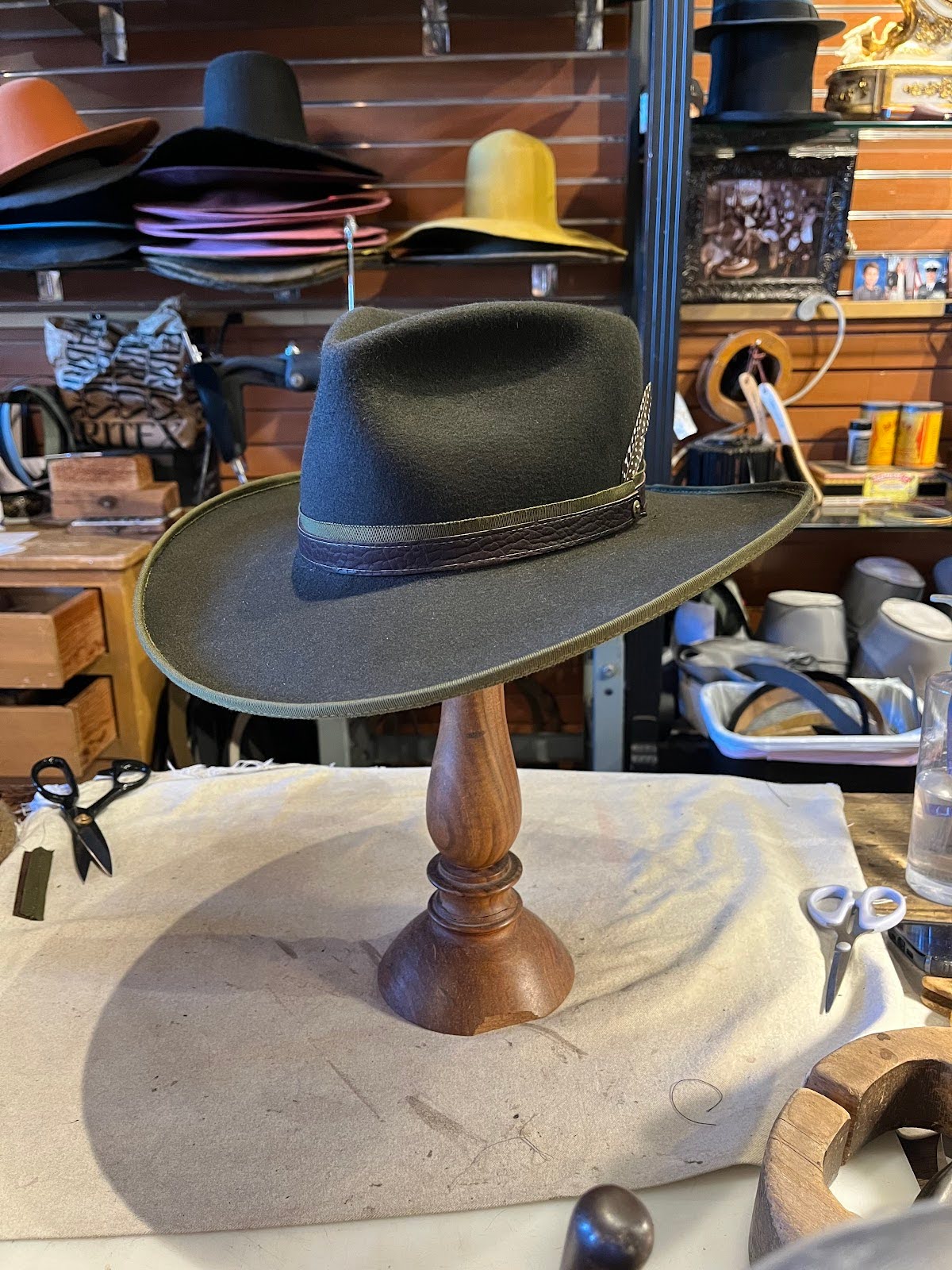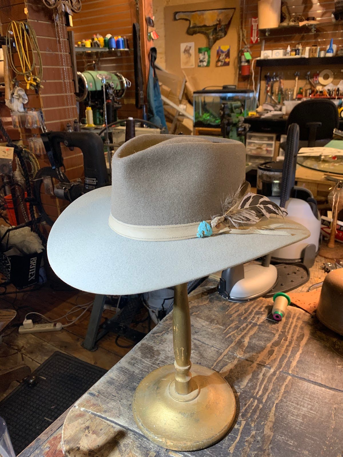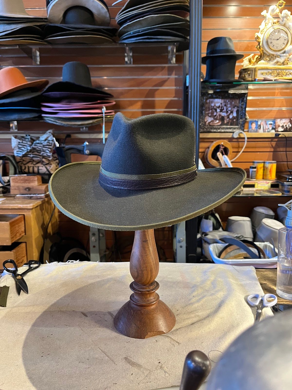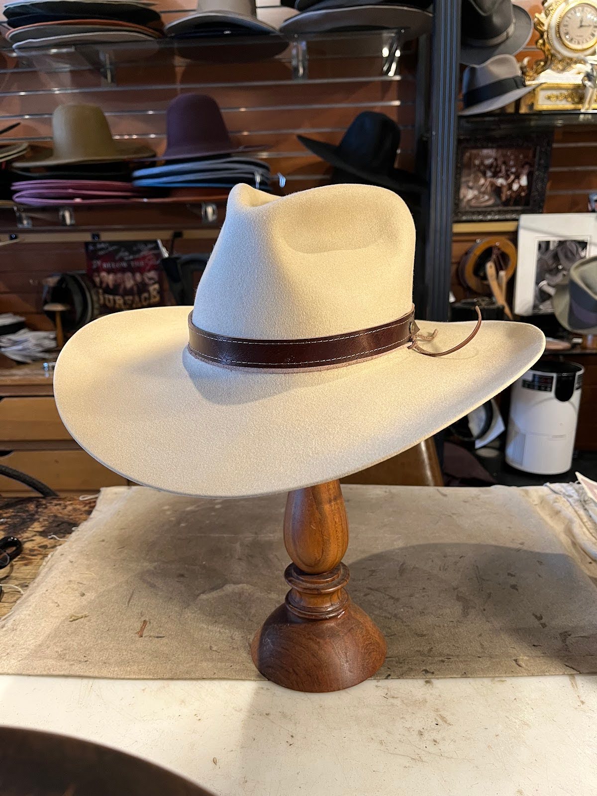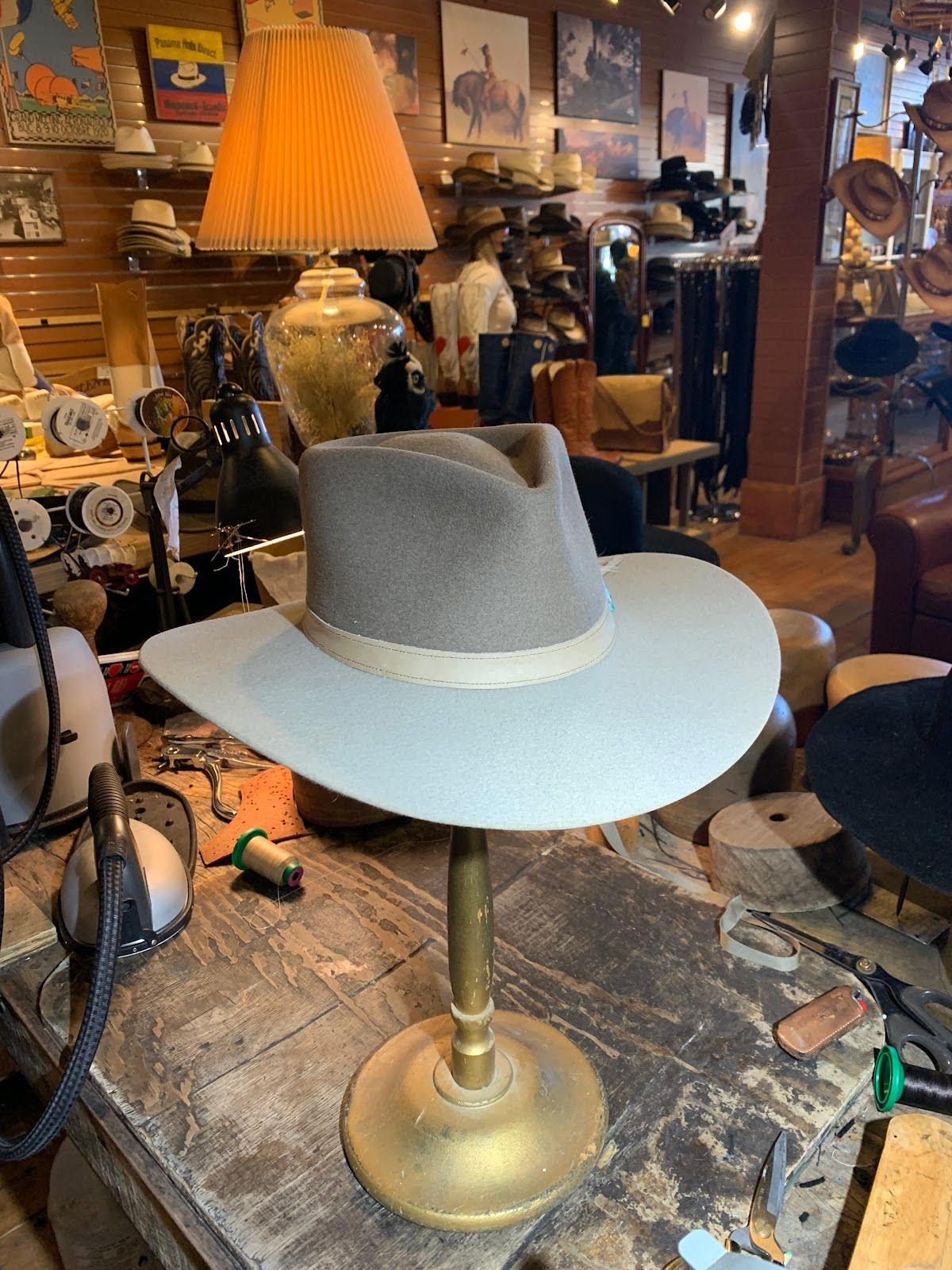 Characteristic features of this hat include a curved 2 ½” brim, 4” crown, and crown back with a 5” open crown. Hat bands vary, and can be tailored to suit individual preferences, with such options as leather, matching felt buckle, horsehair, or grosgrain ribbon.