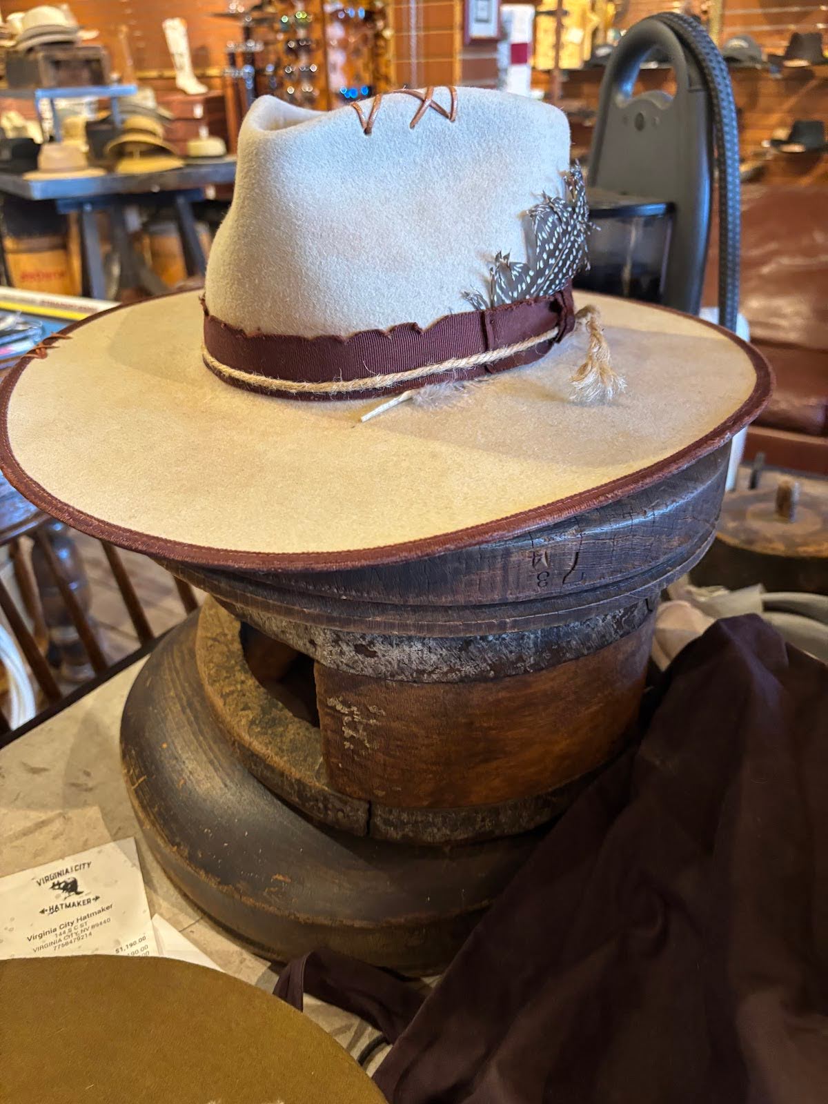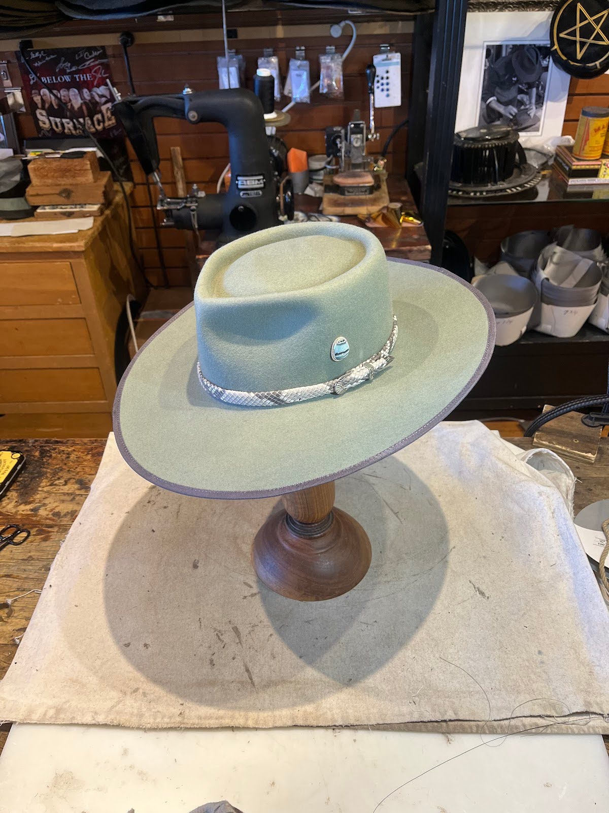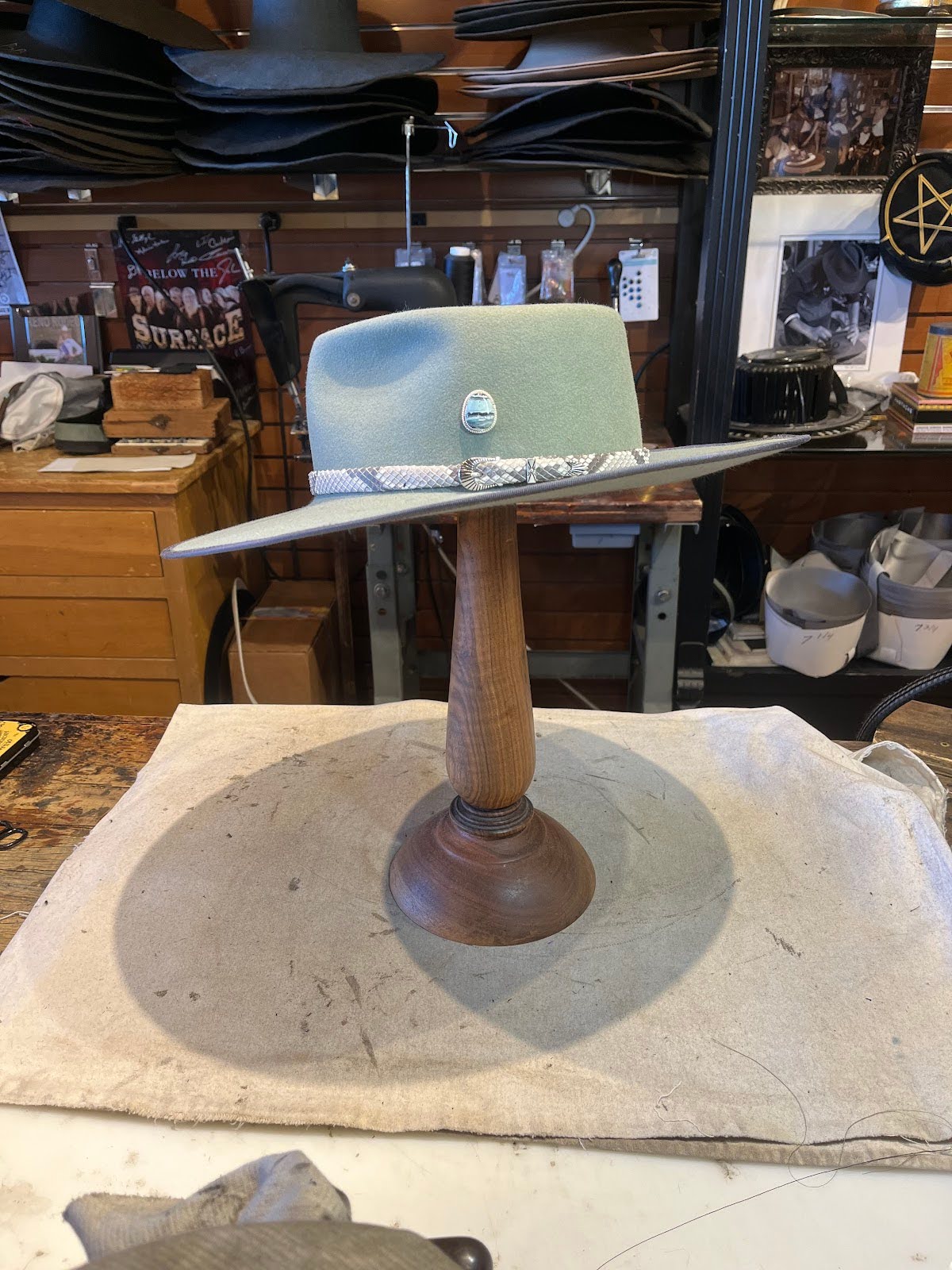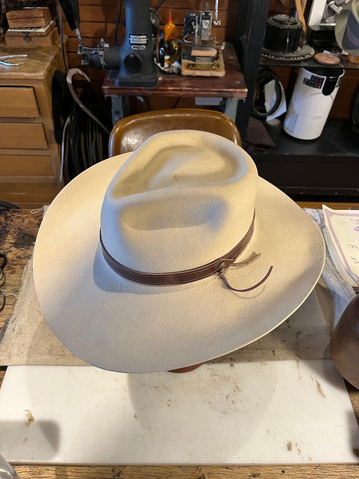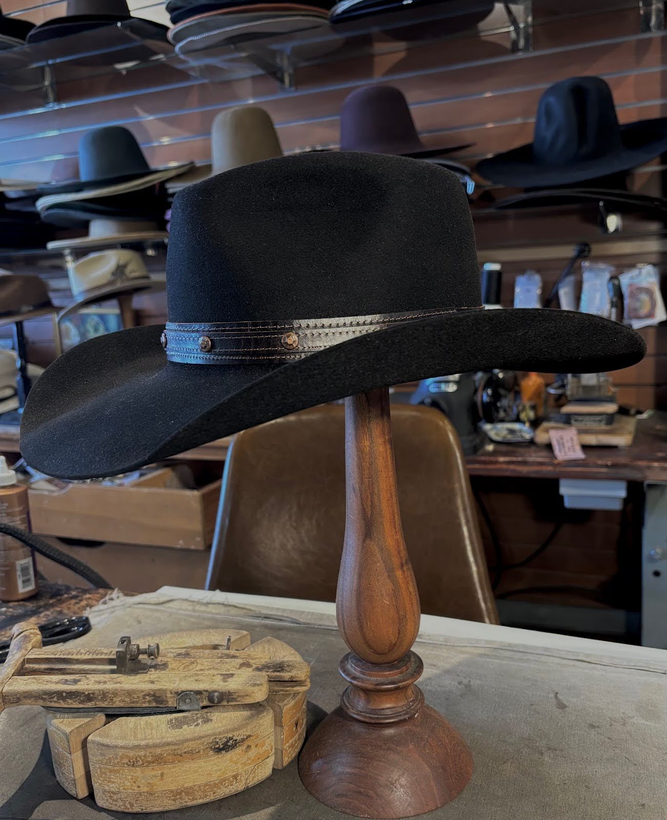 Characteristic features of this hat include a curved 2 ½” brim, 4” crown, and crown back with a 5” open crown. Hat bands vary, and can be tailored to suit individual preferences, with such options as leather, matching felt buckle, horsehair, or grosgrain ribbon.
